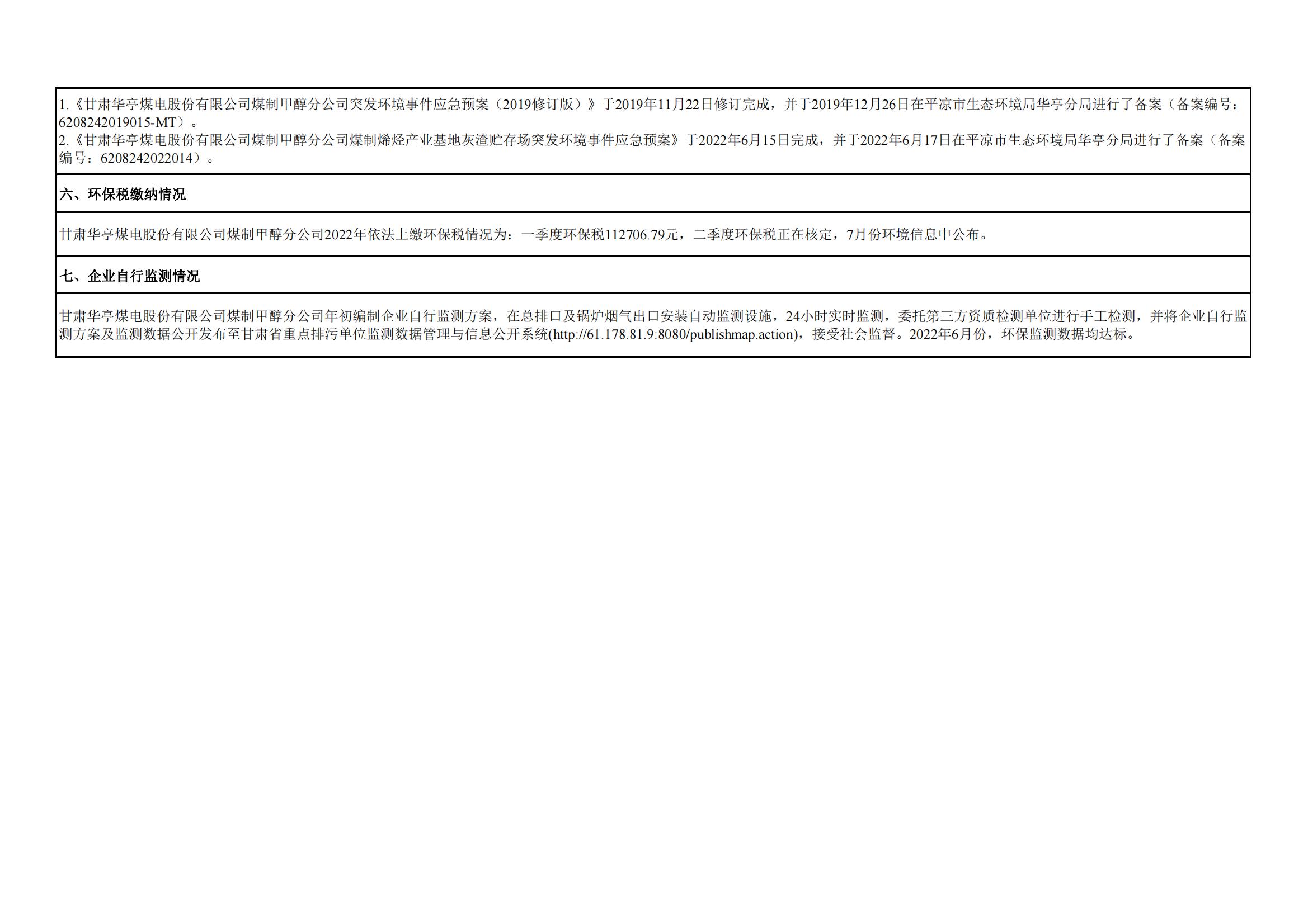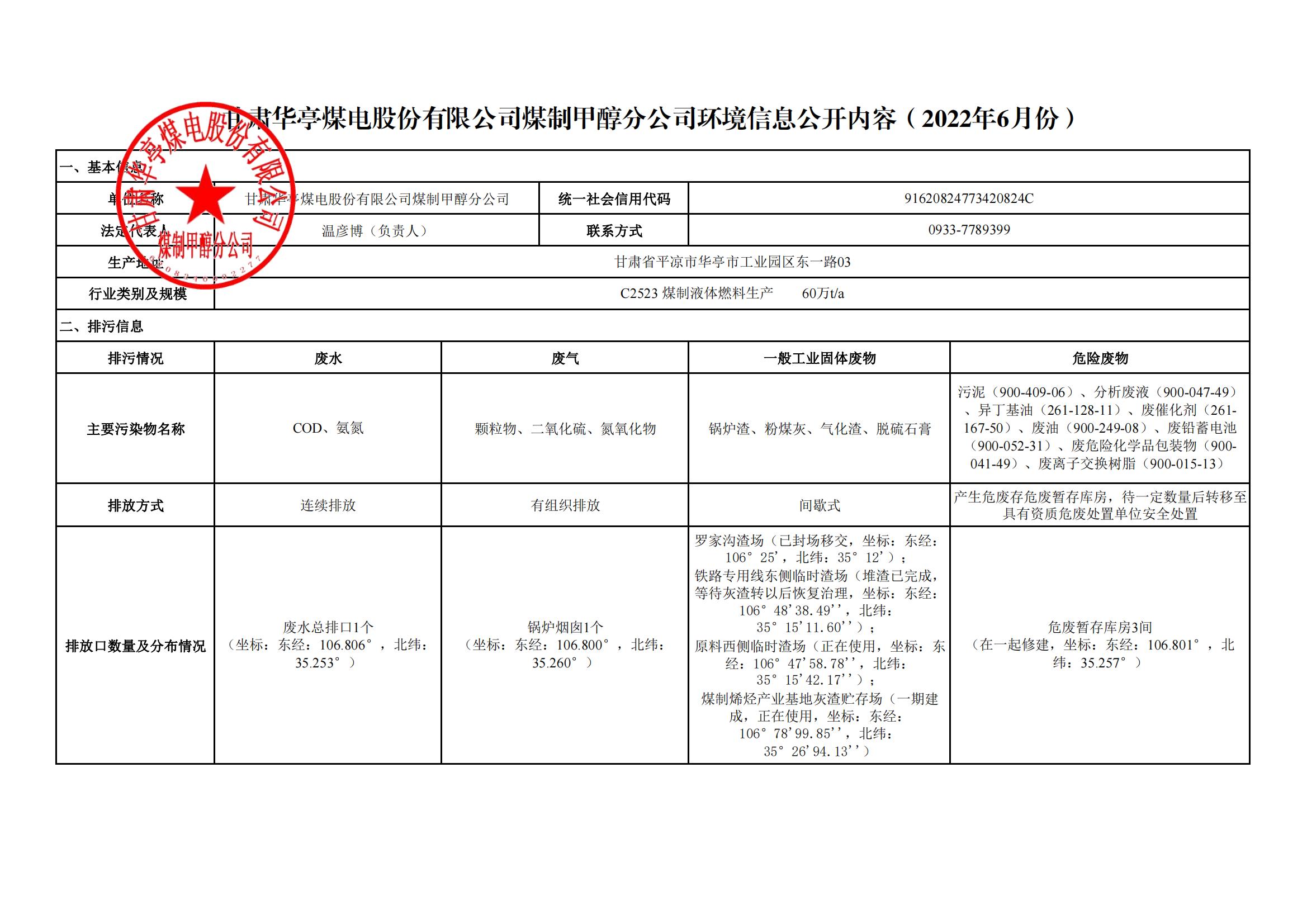 煤制甲醇分公司環(huán)境信息公開內(nèi)容(2022年6月)