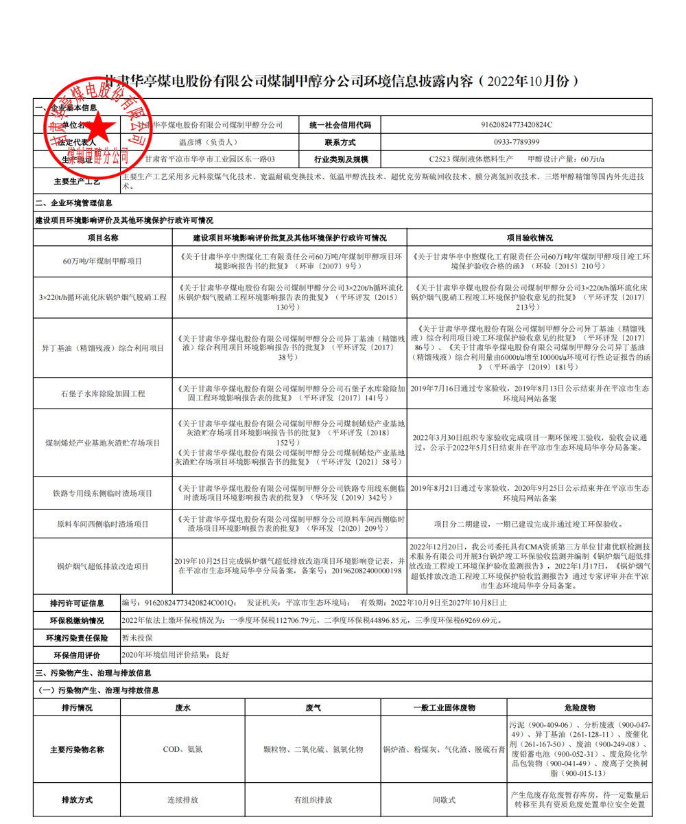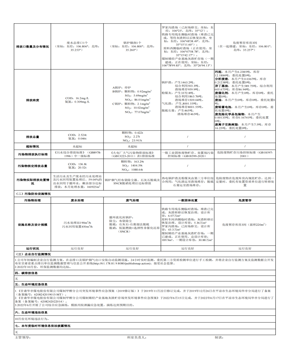 煤制甲醇分公司環(huán)境信息公開內容(2022年10月)